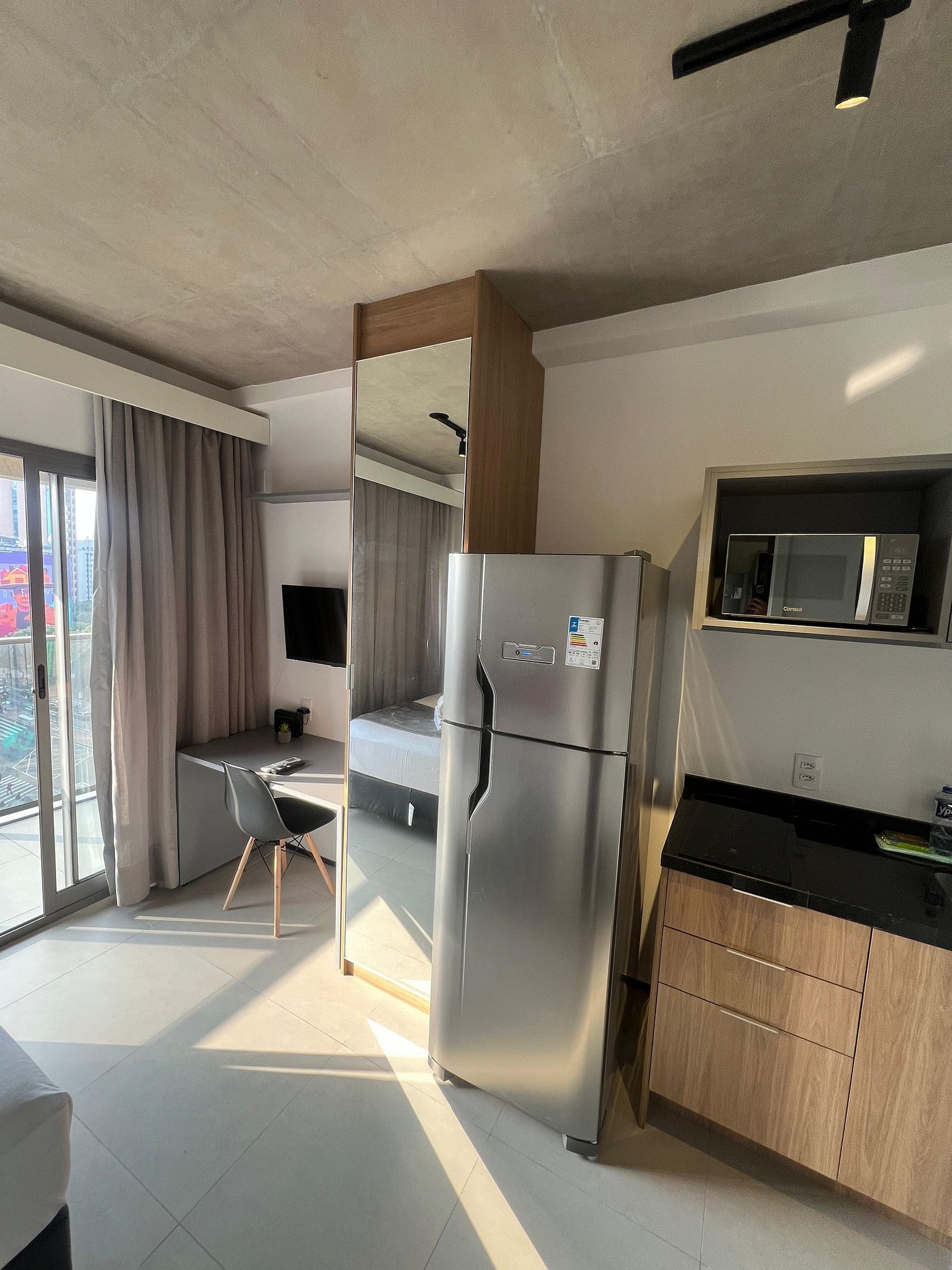 Nosso espaço é totalmente reservado e pensando para que você tenha uma estadia mais próximo do aconchego do seu lar, seja para poucos dias ou para morar por um tempo. Possuí cozinha completa equipada com fogão e todos utensílios para preparo de refeições, micro-ondas, cafeteira e geladeira. Cama casal com enxoval completo, travesseiros e mantas/edredom para aqueles dias mais frios. Ar condicionado, TV com função smart e internet a disposição. Banheiro com chuveiro aquecimento a gás e secador de cabelos. No roofttop temos cadeira e sofá para desfrutar de café da manhã ou aquele fim de tarde e noite com vista maravilhosa de São Paulo e pontos turísticos como Masp, Paulista e Farol Santander.Então VIVA!